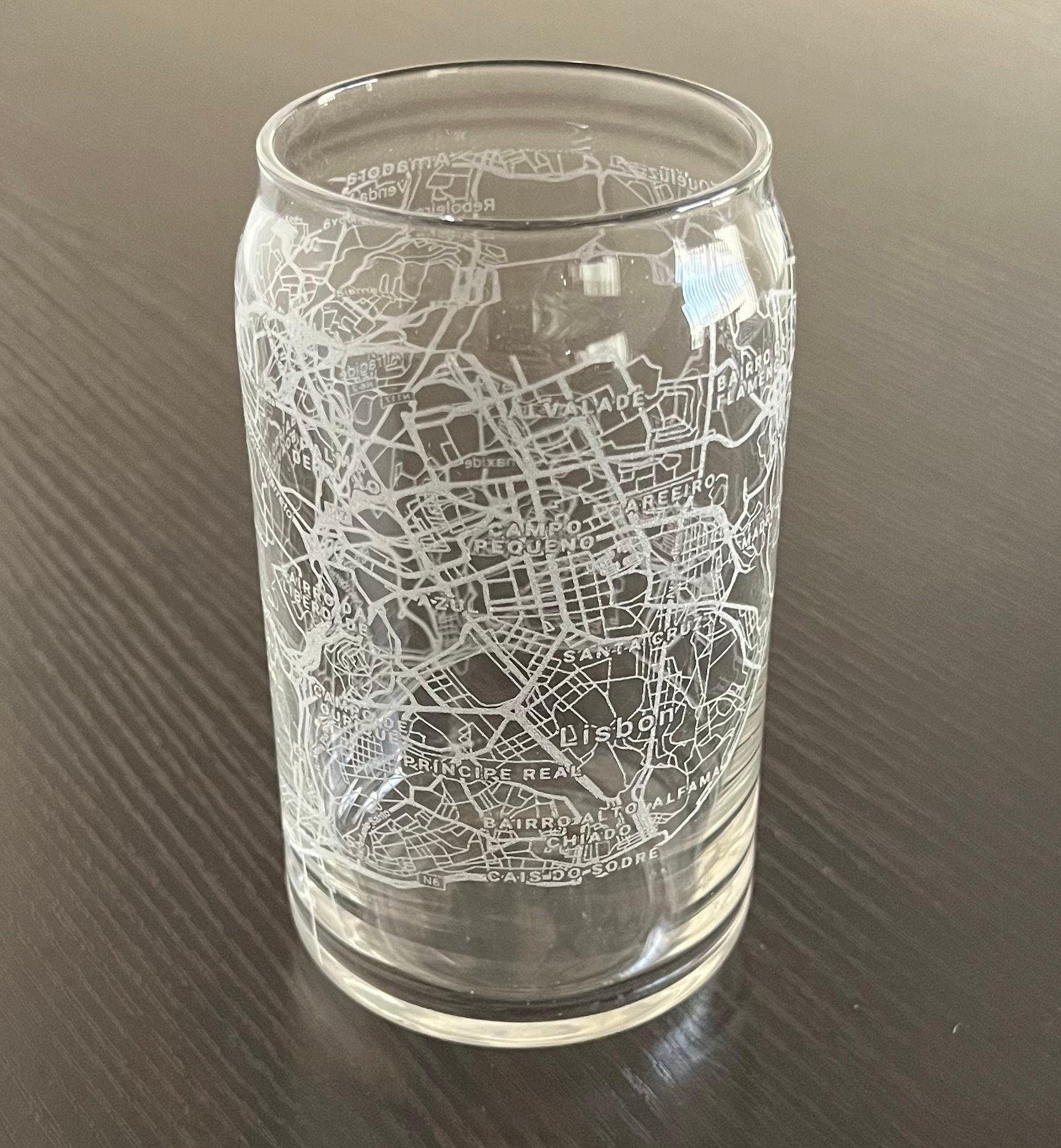 16 oz Beer Can Glass Urban City Map Lisbon, Portugal