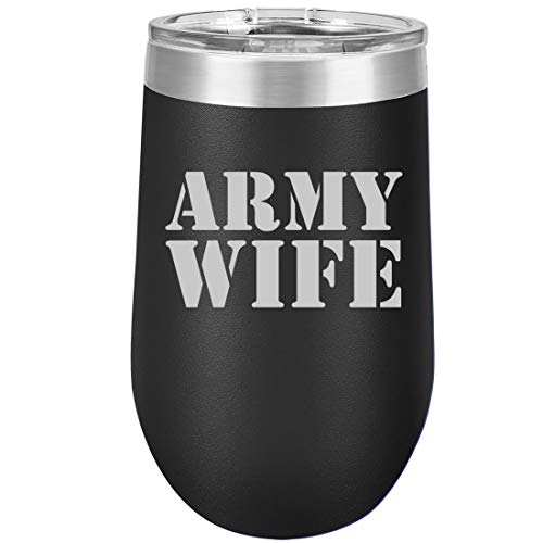 16 oz Double Wall Vacuum Insulated Stainless Steel Stemless Wine Tumbler Glass Coffee Travel Mug With Lid Army Wife (Black)