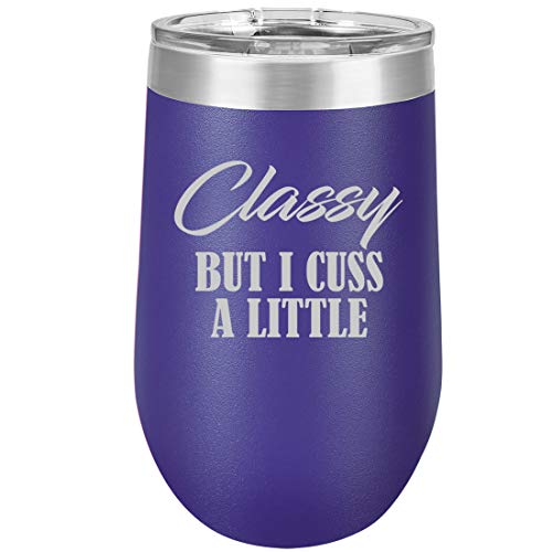 16 oz Double Wall Vacuum Insulated Stainless Steel Stemless Wine Tumbler Glass Coffee Travel Mug With Lid Classy But I Cuss A Little Funny (Purple)