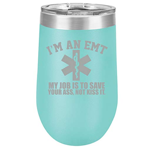 16 oz Double Wall Vacuum Insulated Stainless Steel Stemless Wine Tumbler Glass Coffee Travel Mug With Lid EMT Job Is to Save You (Teal)