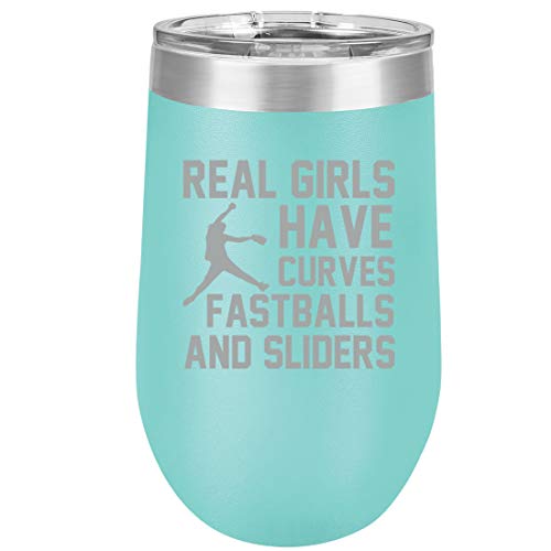 16 oz Double Wall Vacuum Insulated Stainless Steel Stemless Wine Tumbler Glass Coffee Travel Mug With Lid Real Girls Curves Softball (Teal)
