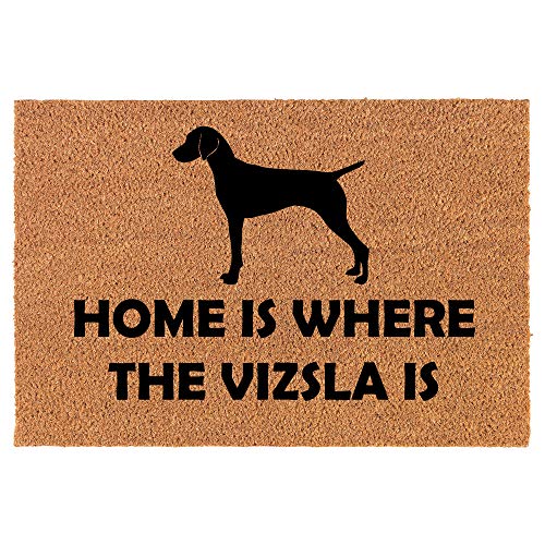Coir Doormat Front Door Mat New Home Closing Housewarming Gift Home is Where The Vizsla is (30" x 18" Standard). 100% coir pile with rubber non slip backing. Great for housewarming, newylwed, wedding or new home purchase gift. To prolong the life of your mat keep in a sheltered area. To clean simply shake out