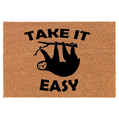 Coir Doormat Front Door Mat New Home Closing Housewarming Gift Take It Easy Sloth Funny (24" x 16" Small). 100% coir pile with rubber non slip backing. Great for housewarming, newylwed, wedding or new home purchase gift. To prolong the life of your mat keep in a sheltered area. To clean simply shake out